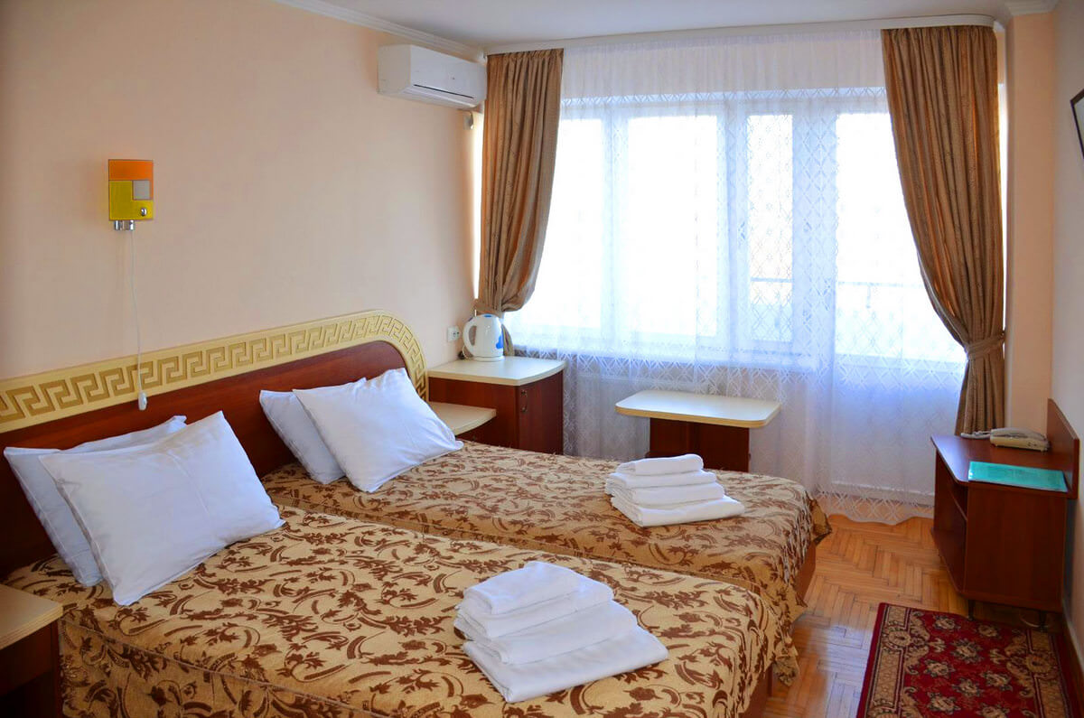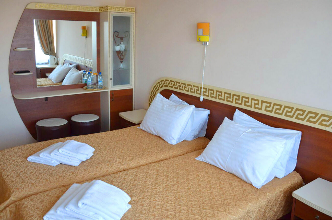 Площадь номера - 16 кв.м. 2 осн. места. 1 доп. место. Балкон. Мебель: вешалка, зеркало, кровати односпальные, прикроватные тумбочки, столик журнальный, тумба, шкаф. Оборудование: кондиционер, телевизор, телефон, холодильник, чайный набор посуды, электрочайник. Санузел: с душем, туалетные принадлежности, фен. Сервис: смена полотенец (1 раз в 3 дня), смена постельного белья (1 раз в 5 дней), уборка номера (ежедневно), услуги внутренней телефонной связи.